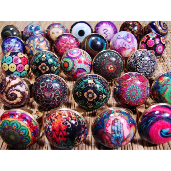 Description : Bagues constituées d'un anneau surmonté d'un dôme du même métal imprimé puis stratifié, donnant aux bijoux un aspect émaillé. Elégantes et colorées, de part leur taille ajustable elles s'adapteront parfaitement aux phalanges. Conformément à la législation européennes, nos bijoux sont garantis sans nickel ni oxyde de plomb.