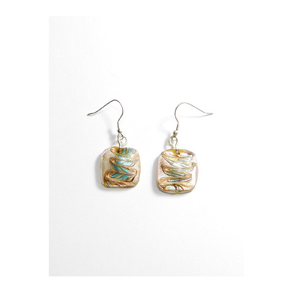 Boucles d'oreilles en verre avec inclusion d'une feuille d'argent à chaud lors du modelage. D'inspiration Murano, les motifs sont teintés dans la masse avec du verre coloré et des oxydes métalliques.