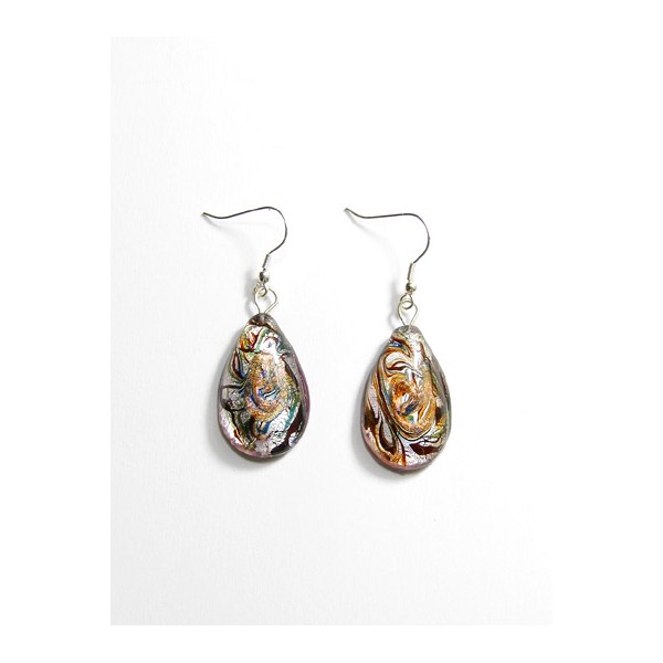 Boucles d'oreilles en verre avec inclusion d'une feuille d'argent à chaud lors du modelage. D'inspiration Murano, les motifs sont teintés dans la masse avec du verre coloré et des oxydes métalliques.