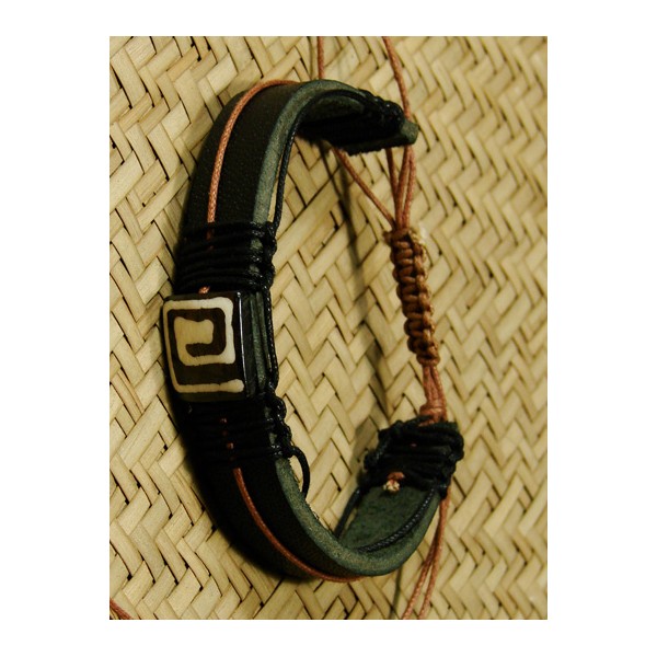 Bracelet en cuir et macramé en lien coton sur lequel est montée une pièce d'os. La taille du poignet est ajustable en tirant sur les extrémités du macramé.